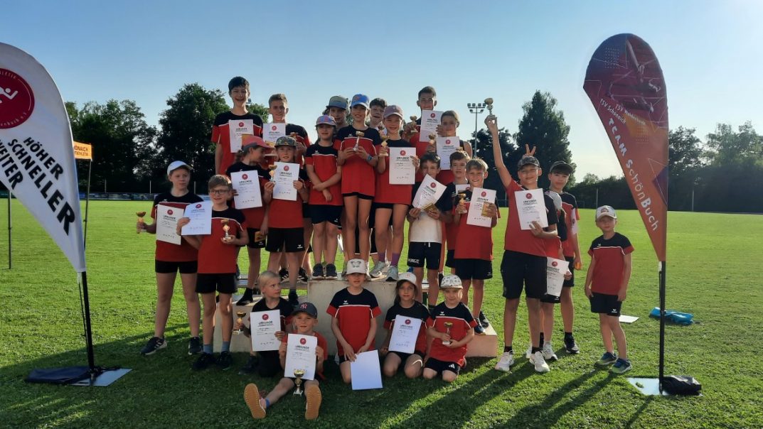 Es sollte über 30 Grad werden, aber die Renninger hatten mit Zelten und vielen Wasserkübeln, in denen die Kappen und Köpfe eingetaucht wurden, gut vorgesorgt. Dieses Mal gab es einen Sprint, Weitsprung, Medizinball stoßen und 400m-Hindernislauf. In der U8 starteten 11 Teams: die Schönbuchflitzer 1 (Stefano, Eliah, Amelie, Helene) erreichten den 2. Platz und die Schönbuchflitzer 2 (Levi, Liam, Lea, …