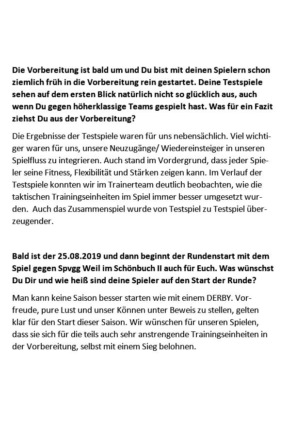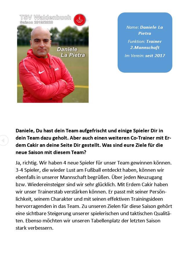 Wie allen sicher schon aufgefallen sein wird, beginnt die neue Saison am kommenden Sonntag den 25.08.2019 mit den Spielen auf dem Hasenhof. Wir haben uns mal zur Aufgabe gemacht, die Menschen sprechen zu lassen, die für diese Saison viel geplant und gearbeitet haben. Aus diesem Grunde, werden wir jeden Tag ein kleines Interview veröffentlichen, um Euch allen einen Einblick hinter die Kulisse des TSV geben zu können. Heute haben wir Daniele LaPietra, Trainer der 2.Mannschaft gebeten, uns ein paar Fragen zu beantworten.