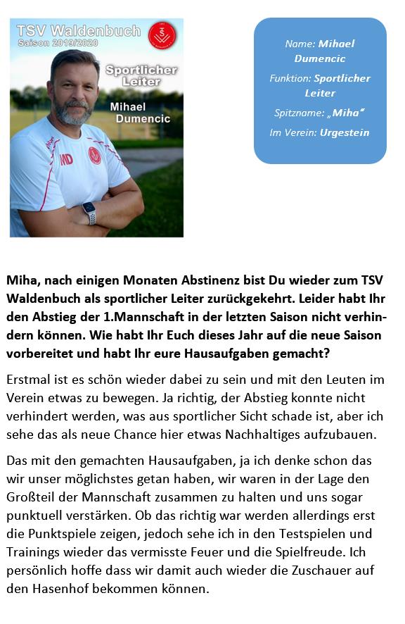 Wie allen sicher schon aufgefallen sein wird, beginnt die neue Saison am kommenden Sonntag den 25.08.2019 mit den Spielen auf dem Hasenhof. Wir haben uns mal zur Aufgabe gemacht, die Menschen sprechen zu lassen, die für diese Saison viel geplant und gearbeitet haben. Aus diesem Grunde, werden wir jeden Tag ein kleines Interview veröffentlichen, um Euch allen einen Einblick hinter die Kulisse des TSV geben zu können. Heute haben wir Mihael Dumencic hier, ein bekanntes Gesicht in Wabu und sportlicher Leiter des TSV Waldenbuch Abt. Fussball.