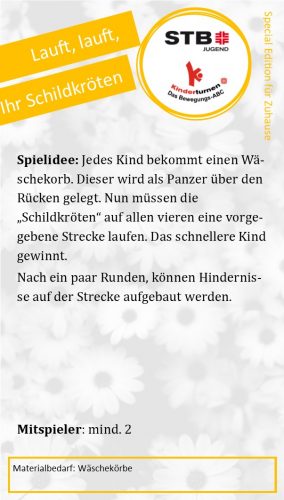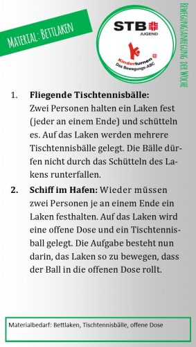 Eine Schnur wird quer durch das Zimmer gespannt und Eltern und Kinder verteilen sich auf beiden Seiten. Jede*r Mitspieler*in erhält eine Fliegenklatsche als Schläger. Dann wird mit einem Luftballon Federball gespielt. Wer keine Fliegenklatsche zur Hand hat, kann sich eine Zeitung zusammenrollen und mit Klebeband umwickeln.