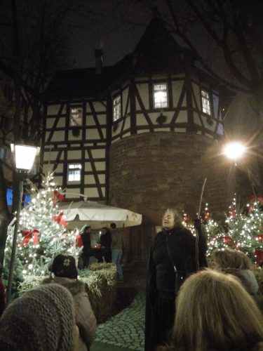 In diesem Jahr führte uns unsere Jahresabschluss-Veranstaltung zurück in die Vergangenheit ins Reich der Sagen und Legenden. Bei einer Geisterführung in Stuttgart – vorbei an der Stiftskirche, über den Schillerplatz zum ehemaligen Waisenhaus und durchs Bohnenviertel zur Leonhardskirche – erfuhren wir so manche spannende und gruselige Geschichte über Spukgestalten im alten Stuttgart. Zu jedem dieser Orte gibt es eine Sage, die auf historisch verbrieften Gegebenheiten beruht. So erfuhren wir beispielsweise, dass die Hauptstätter Straße danach benannt wurde, dass sie zur damaligen Enthauptungsstätte – dem heutigen Wilhelmsplatz – führte, wo dann auch der Postmichel aus Esslingen ein grausiges Ende fand. Und im Hof des Waisenhauses ruft immer noch eine verzweifelte Mutter nach ihrem Kind, das sie dorthin weggeben mußte. Unsere Stadtführerin hat uns prächtig unterhalten und trotzte stimmlich auch den Geräuschen vom Weihnachtsmarkt und dem Glockengeläut der Leonhardskirche.