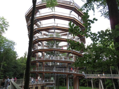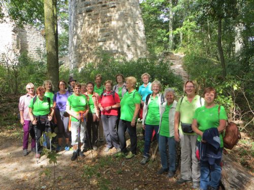 ![]() Fast alle Frauen sind die vielen Stufen hinauf zur Stollburg Mit dem Bus und 26 Frauen sind wir ins Land der Franken und in den Naturpark Steigerwald gefahren. Die erste kurze Wanderung beim kleinen Dorf Handthal ging auf den Stallberg (372 m), mit dem höchstgelegenen Weinberg Frankens. Ein besonderer Weinlehrpfad über die Geschichte des Weinanbaues führte mit 230 Stufen hinauf zur Ruine der Stollburg. Dort wurde wahrscheinlich 1169 der Minnesänger Walther von der Vogelweide geboren. Wir genossen von der Aussichtsplattform einen weiten Blick südwärts in die Ebene. ![]() Der 42 m hohe Turm des Baumwipfelpfades. Nächstes Ziel dann das Steigerwald-Informationszentrum. Hier gab es nicht nur jede Menge Infos, wir konnten auch unser Vesper verzehren. Gestärkt und ausgeruht wanderten wir dann durch den Wald zum Baumwipfelpfad Steigerwald. Holzstege mit 1.150 m Länge führen in unterschiedlichen Höhen zum 42 m hohen Turm. Hier waren wir über den Baumkronen und konnten uns an der Aussicht weit übers Land erfreuen.
