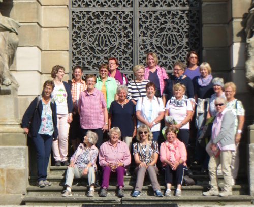 ![]() Auch wenn der Hintergrund nicht schön ist: in Bamberg wird viel restauriert und renoviert. Hier ist die ganze Frauengruppe an der Gartenseite der Neuen Residenz. Bamberg-Tag war der Samstag und begann mit einer zweistündigen Führung durch die Bamberger Altstadt. Sie steht seit 1993 auf der Liste des UNESCO-Weltkulturerbes und hat einen der größten unversehrt erhaltenen Altstadtkerne Europas. Uns blieb noch freie Zeit, um den altehrwürdigen Bamberger Dom zu besuchen. Bekannteste Schätze sind der sog. Bamberger Reiter (von 1235), das von Tilman Riemenschneider 1513 gestaltete Hochgrab des Kaiserpaares Hinrich II. und Kunigunde sowie der Marienaltar (1523) des Veit Stoß. Nach so viel Kunst und Kultur mussten auch die leiblichen Genüsse zum Zuge kommen. Im traditionsreichsten Brauhaus, dem „Schlenkerla“, genossen wir ein deftiges Essen und dazu als Bamberger Spezialität das Rauchbier, auch wenn nicht alle den rauchigen Geschmack gut fanden.