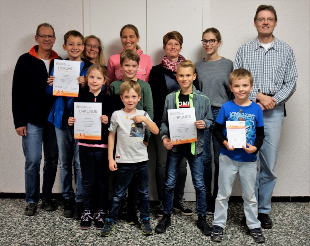 Dass Sportabzeichen auch in der Familie Spaß machen kann, haben in diesem Jahr 5 Familien bewiesen. Mindestens 3 Mitglieder aus 2 Generationen müssen die Leistungen erbringen um eine Familienurkunde zu erhalten. Nicht nur beim Gruppenbild bei der Verleihung, sondern auch beim Training und bei den Abnahmen im Stadion hatten alle ihren Spaß und waren mit Ehrgeiz bei der Sache.