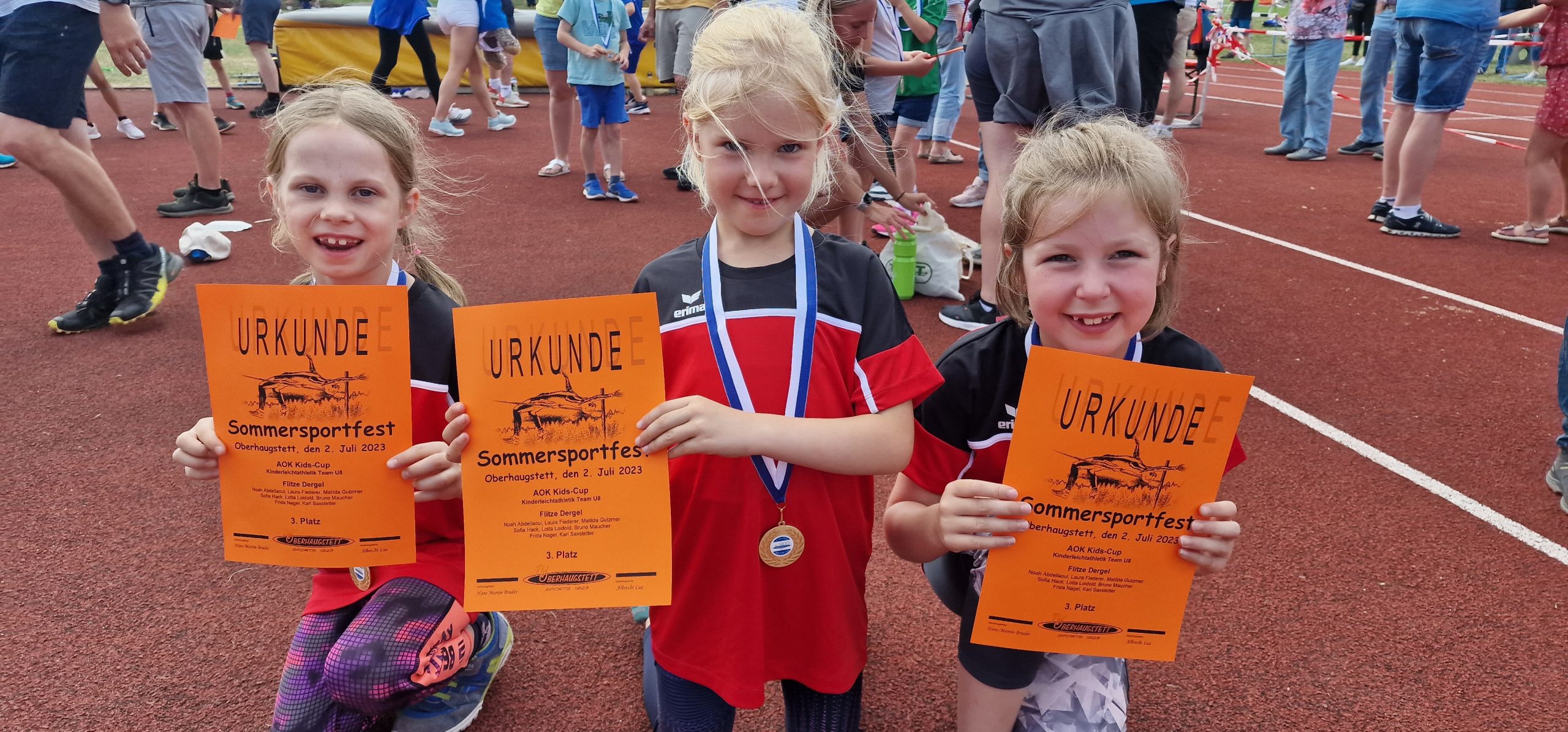 Bei sonnigem, aber sehr windigem Wetter ging es letzten Sonntag für die “Flitze Dergel” zum vorletzten Wettbewerb des KidsCup nach Oberhaugstett. Trotz teilweise ungewohnte Disziplinen, wie Stabweitsprung und Drehwurf, haben Mathilda, Sofia und Frida, gemeinsam mit ihren Mannschaftskollegen aus Schönaich sehr gute Ergebnisse erreicht. Was am Ende zu einem tollen 3. Platz in der Mannschaftswertung geführt hat. In der aktuellen Gesamtwertung liegt die U8 nun mit jeweils 1 Punkt Unterschied zwischen Böblingen und Renningen auf dem 2. Platz.
