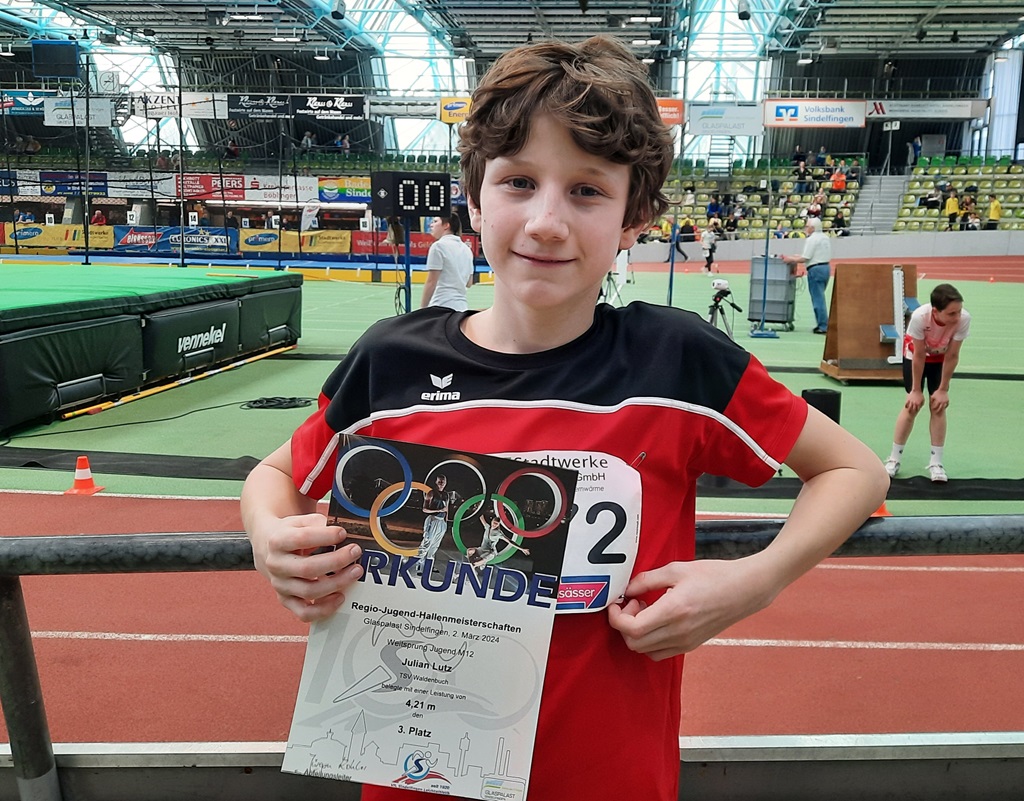 Glaspalast Sindelfingen am Samstag, 02.03.2024. Julian Lutz startete in seiner Altersklasse U14/M12 über 60m Sprint, lief mit sehr guten 9,11sec ins Finale und belegte bei einem knappen Rennen mit 9,10 sec den 6.Platz. Seine beste Leistung und mit neuer Bestweite von 4,21m war der 3.Platz beim Weitsprung. Die 800m konnte er bei den Vorderen nicht mitlaufen. Mit 100m Abstand lief er mit 2:49min ins Ziel. Für Ihn zeitlich eine Verbesserung, war er trotzdem über den 6. Platz verständlicher Weise enttäuscht. Alles in Allem aber ein sehr guter Einstieg in die neue Saison. Weiter so Julian!