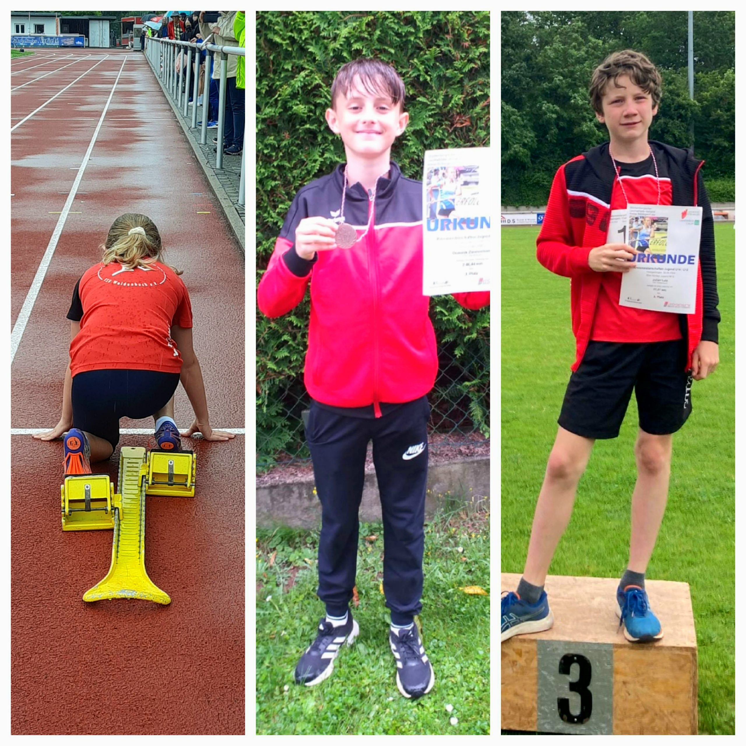 Zum Glück nicht so heiß wie tags zuvor, aber so windig und nass hätte es auch nicht gebraucht. Naja, Leichtathletik ist ein Draußensport und da muss man durch. Natürlich nix für Bestwerte, aber 3x knapp an der Anfangshöhe von 1,28m scheitern, wie es unserem Hochsprungtalent Julian Lutz (M12) passiert ist, dass wäre nicht nötig gewesen. Schade für ihn, der Titel wäre ihm sicher gewesen. Ein kleiner Trost blieb ihm aber mit dem 3. Platz zum ersten Mal über die 60m Hürden und mit einem 4. Platz mit weit gesprungenen 4,24m. Madeleine Sterk (W12) bei ihrem ersten U14 Wettkampf wirkte sehr nervös. Über 75m und Weit zwar nicht vorne dabei, aber dabeisein ist alles. Dominik Zimmermann (M13) startete erst zum frühen Nachmittag. Ihn erwischte der Regen und Wind am ärgsten. Immerhin konnte er doch seine Besthöhe von 1,24m einstellen, was ihm den 6. Platz einbrachte. Den strömenden Regen beim 800m unterlief er einfach und sein unermüdlicher Kampfgeist brachte ihm mit 2:46min den Bronzetitel.