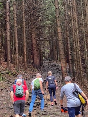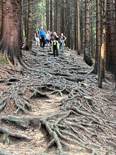 Wer am Sonntag von den Gestarteten noch wanderfähige Beine hatte, machte sich mit auf zu einer kleinen Wanderung, auf einem wahrlich wurzeligen Weg, hinauf zur Buchenberg-Alm.