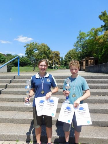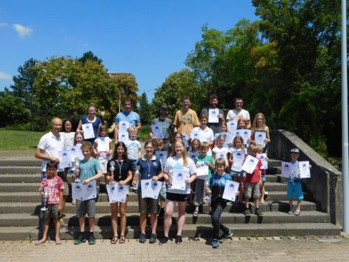 Nach der Auswertung gab es die Siegerehrung. Direkt vor dem Hallenbad bei schönstem Wetter wurden Urkunde, Medaillen und Pokale verteilt.
