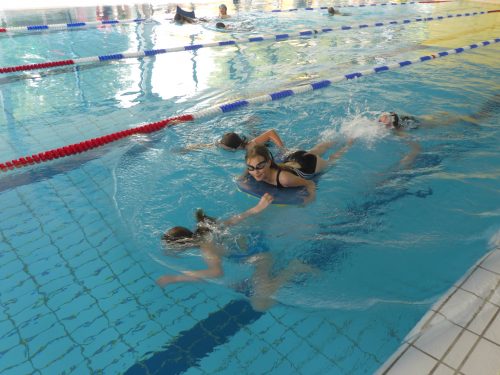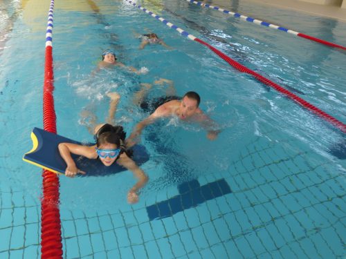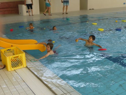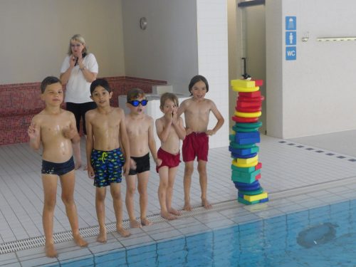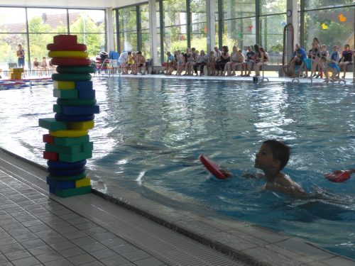 Nach der Begrüßung durch unseren Abteilungsleiter Stefan ging es für unsere Kleinsten ans Turm bauen. Dazu mussten Bausteine von einem Beckenrand zum anderen transportiert und dort zu einem Turm aufgeschichtet werden. Das Ganze war als Teamwettkampf konzipiert. Sobald der Turm eine bestimmte Höhe erreicht hatte, hat das Team gewonnen.