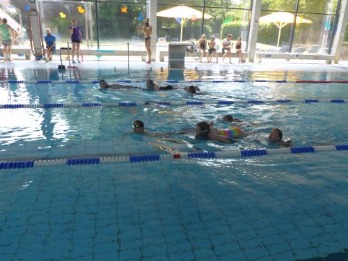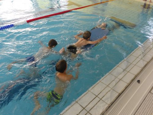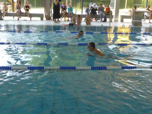 Im letzten Teil des Wettkampfes sind insgesamt 6 Staffeln mit je 4 Teilnehmern angetreten. Jeder Teilnehmer musste zunächst, dem Prinzip einer Staffel folgend, 50m schwimmen (die Kleineren nur 25m). Danach galt es für die Staffeln, 50m als Team zu bewältigen. Eine / einer liegt, sitzt oder steht auf einem Brett (Sitzen oder Stehen war leider nicht zu sehen, alle haben sich für’s Liegen entschieden), und wird von den anderen geschoben, gezogen oder sonst irgendwie durch’s Wasser bewegt. Alle 6 Staffeln haben ihr Bestes gegeben und bis zum Schluss gekämpft. Siegerstaffel waren ‘Die Flotten Seepferdchen’. Und nicht nur im Staffelwettbewerb, sondern in allen Rennen, war es beeindruckend zu sehen mit wieviel Feuereifer jede und jeder Einzelne dabei war und das Beste aus sich herausgeholt hat.