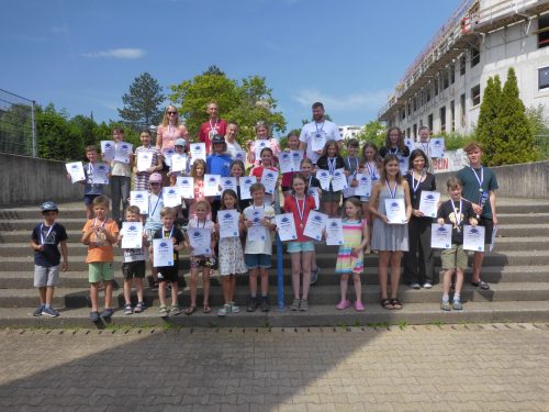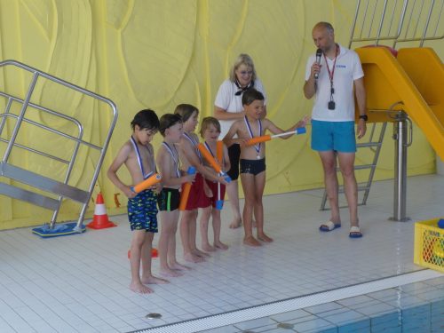 Während die Zeiten ausgewertet, die Platzierungen ermittelt und die Urkunden gedruckt wurden, durften alle Teilnehmer im Schwimmbecken spielen oder sich mit Kuchen stärken. Zum Abschluss der Veranstaltung verteilte Stefan die Urkunden, Medaillen und Pokale.