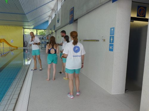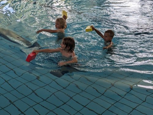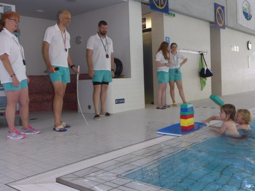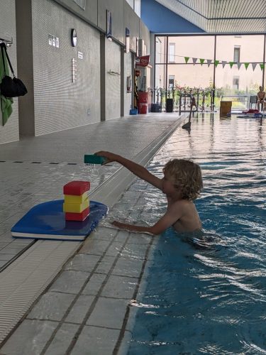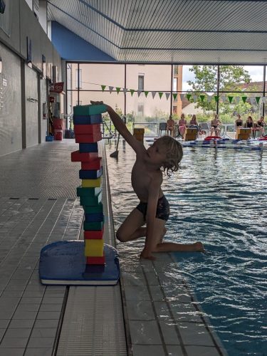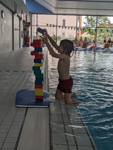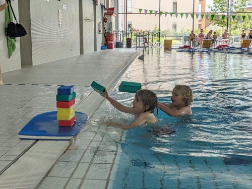 - Nichtschwimmer: Bausteine durch’s Becken tragen und damit einen Turm bauen