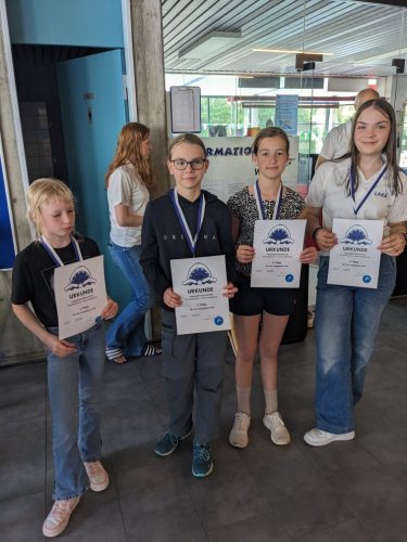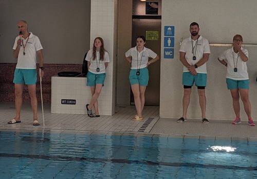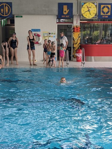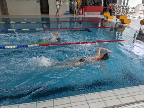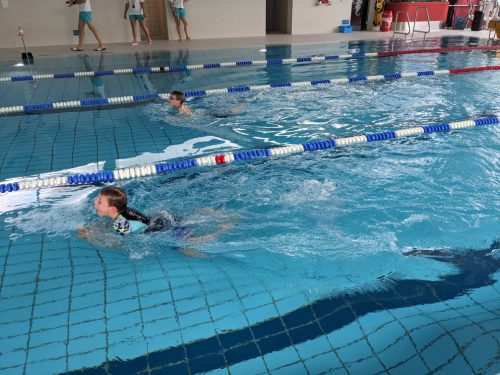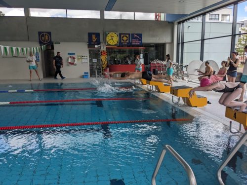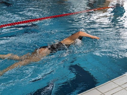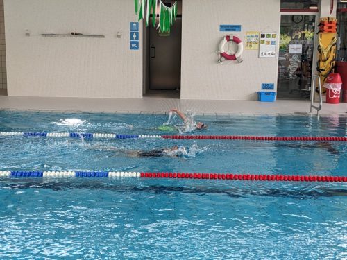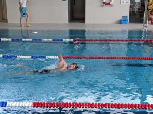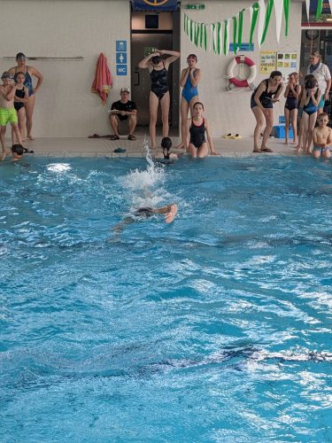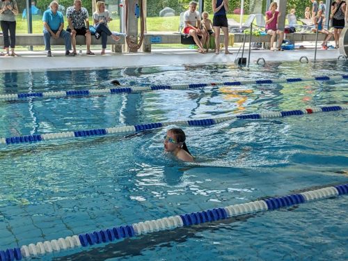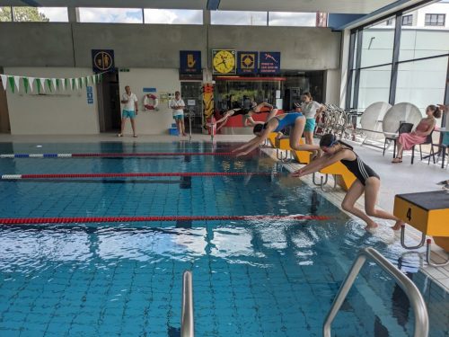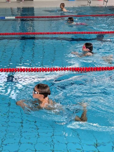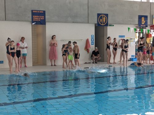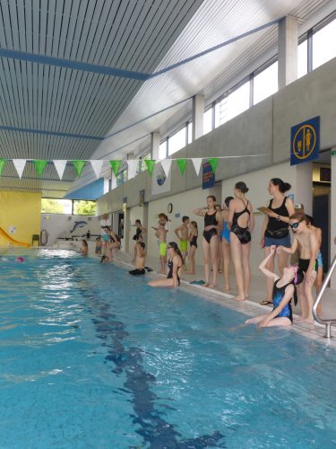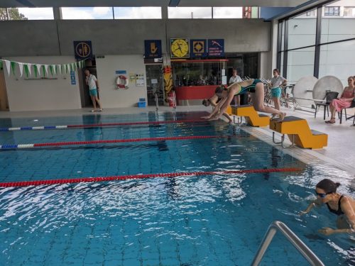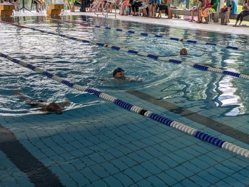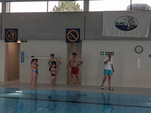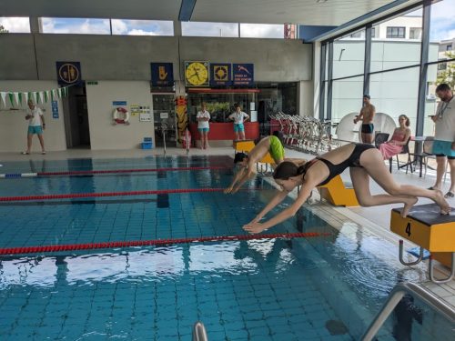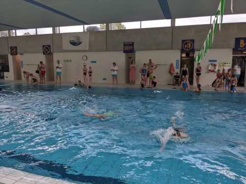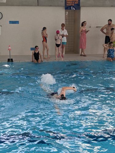 Den Abschluss bildeten wie jedes Jahr die Staffeln. Dieses Jahr haben wir etwas Neues ausprobiert. Es wurde quer durchs Becken geschwommen, und die Anzahl der erreichten „Bahnen“ bestimmte den Sieger. Gewonnen haben die „Papageientaucher“, bestehend aus Pia, Nele, Alix, Elena und Mia.