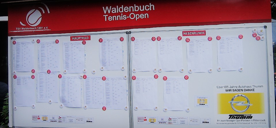 Am Dienstag, einen Tag vor Turnierbeginn, fuhr ich dann zur Anlage im Hasenhof, um meine Auslosung zu betrachten und den Spielort und die Spielzeit zu erfahren. Die Anlage war geschmückt mit Fähnchen und Werbung der Sponsoren (Autohaus Thumm, Climair – Ralf Keppeler, Württembergische Versicherungen, Baufachmarkt Auch, Karl Neff – der einfach ohne Werbung unterstützt) und Zelte waren aufgebaut. Einfach toll. Eines deutschen Ranglistenturniers würdig, dachte ich. Aber kein Aushang mit den Spielzeiten und -orten auf den Tafeln. Tja, sagte man mir: „Das musst Du im Internet nachschauen“. Scheinbar bin ich noch nicht ganz im digitalen Zeitalter angekommen; ich gelobe Besserung!