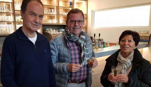 Zur Begrüßung ein Glas Sekt: Karin und Hansjörg Denz mit Schatzmeister Jürgen Först (li.) Foto: HH