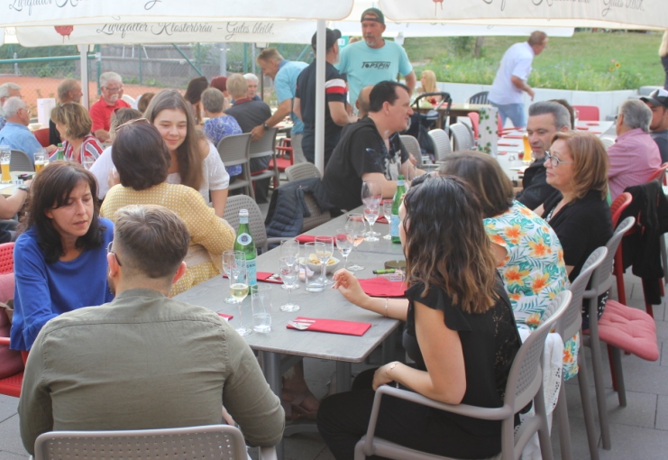 Es gab ein Glas Prosecco zur Begrüßung, italienische Vorspeisen, zweierlei Pastagerichte, Kalbsschnitzel mit Parmaschinken oder gegrilltes Doradenfilet und als Dessert Tiramisu. Musikalisch untermalt wurde das Menü mit Gesang und Gitarre von Cosimo Lupion. Die Neueröffnung der Tennisgaststätte “Matchpoint” durch unseren neuen Pächter Renato Cervo und sein Team vom Restaurant “Paradiso” stand ganz im Zeichen mediterraner Genüsse. Die Neugier der Besucher war groß – der gewaltige Ansturm der Gäste erwies sich als echte Herausforderung für die Servicekräfte. Die meisten Besucher ließen sich die Feierstimmung indes nicht trüben; sie genossen auf dem Hasenhof einen prachtvollen Sommerabend, der für etliche Gäste erst nach Mitternacht ausklang.