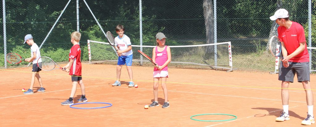 Im Rahmen des vom Stadtjugendreferat organisierten Sommerferienprogramms in Waldenbuch hat die Tennisabteilung des TSV in diesem Jahr zu einem Tennis-Schnuppertraining eingeladen. Trotz der heftigen Hitze dieses Nachmittags waren vier sportive Jugendliche auf den Hasenhof gekommen, um sich von unserem Aktiven-Sportwart Christian Behret die ersten Schritte auf dem (weiten) Weg zum Tenniscrack erklären zu lassen. Bei Balance-Übungen, zunächst mit Luftballons und dann mit Tennisbällen, erfuhren die Teilnehmer*innen, dass es nicht ganz einfach ist, den Ball(on) mit dem Tennisschläger in die gewünschte Richtung zu bewegen. Die Versuche, mit Schläger und Ball ein Ziel anzuvisieren, klappten mit zunehmender Übungszeit aber immer besser.