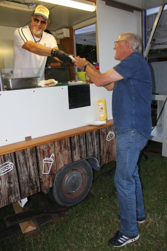 Wenn’s um die Wurst geht: Heiko Waidelich als Helfer an der Ausgabe und Eugen Waidelich als Kunde