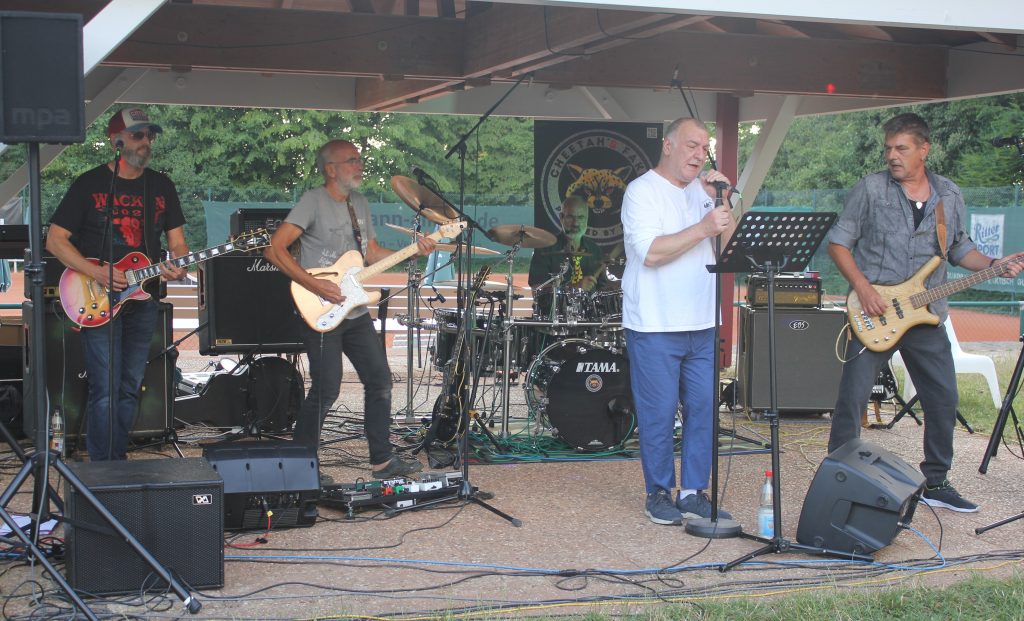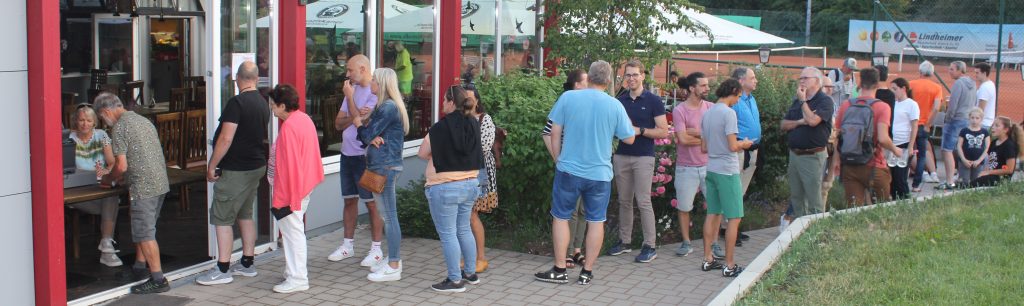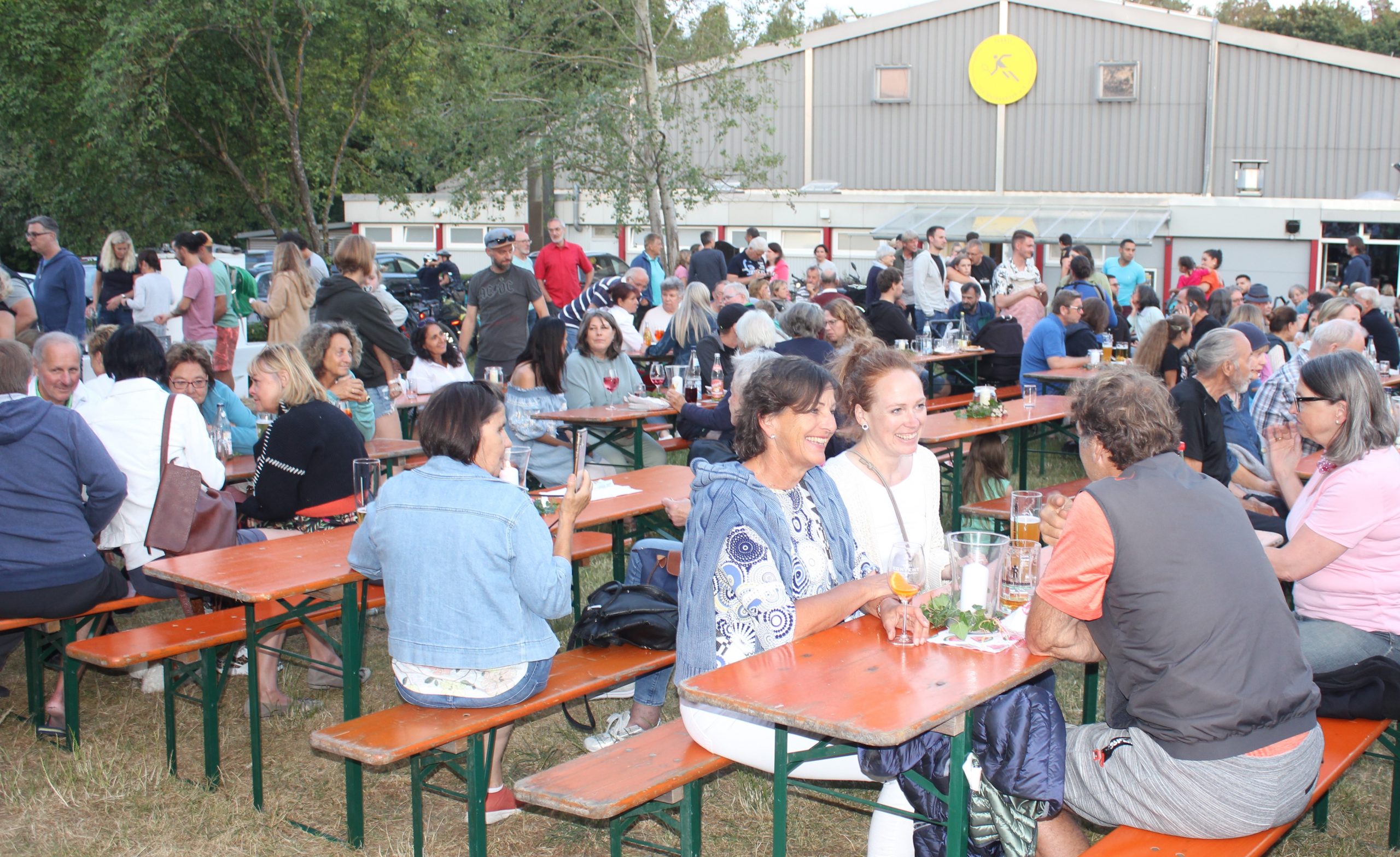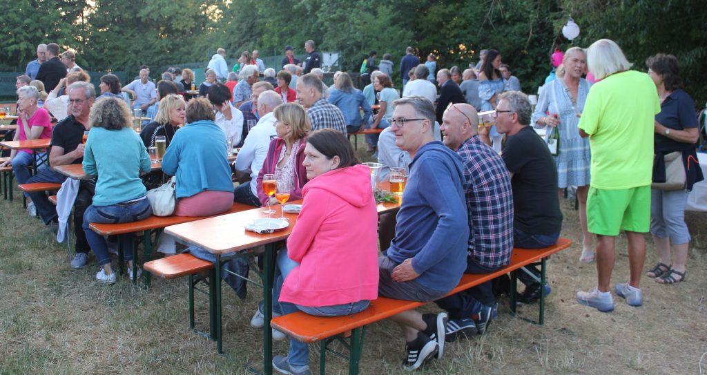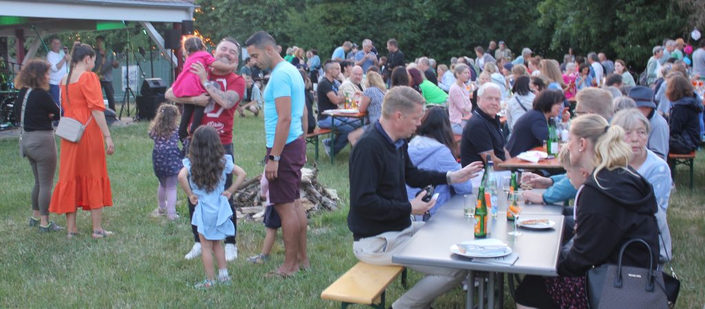 Unsere Veranstaltungs-Wartin Petra Heß hatte alles bestens organisiert: Eine große Zahl freiwilliger, ehrenamtlicher Helferinnen und Helfer der Tennisabteilung sorgte für die Dekoration der Tische, für Getränke aller Art und für zusätzliche Sitzgelegenheiten, nachdem die Kapazität der aufgestellten Bierbänke und Biertische schnell erschöpft war. Leckere Speisen vom Grill und die passenden Beilagen servierte das Team der neuen Gaststätten-Pächterin Patrizia Sena. Dazu gab’s auch kräftig was auf die Ohren: Die Band „Cheetah’s Fake“ heizte den Feiernden ein mit Coverrock, bei dessen Klängen sich auch ältere Besucherinnen und Besuchern wieder jung fühlen konnten. So konnten die Gäste, von Tennis-Abteilungsleiter Gerd Neff willkommen geheißen, es auch akzeptieren, dass wir in diesem Jahr auf das traditionelle Sonnwendfeuer verzichten mussten – die Stadtverwaltung hatte es unter Hinweis auf die allgemein herrschende Brandgefahr in der trockenen Vegetation untersagt.