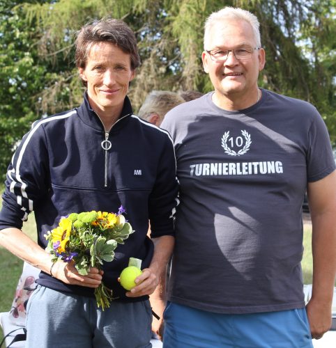 Strahlende Sieger sind ein gewohntes Bild bei Tennisturnieren – bei den 11. Waldenbuch Open gab es indes auch einen tragischen Verlierer. Matthias Mander vom TC Degerloch sah im Finale der Herren 55 gegen Günter Dockhorn (TK Bietigheim) beim Spielstand von 6:1, 5:1 wie der unangefochtene Sieger aus – sprichwörtlich konnte man den Sekt schon kaltstellen. Dann aber ereilte ihn eine Verletzung (vermutlich eine Adduktorenzerrung), er quälte sich noch bis zum 5:5 im zweiten Satz durch die Ballwechsel (unter anderem auch mit Aufschlägen „von unten“) und gab dann auf. Bei der Siegerehrung bewies Matthias Mander als Zweitplatzierter dann, dass auch ihm das Lachen nicht ganz vergangen war. Das galt am Ende einer Regen-intensiven Turnierwoche für alle, die auf ihre Art zum Gelingen der 11. Waldenbuch Open beigetragen haben.