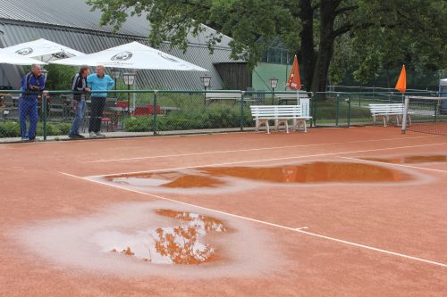 Tennis ist kein Wasserball: Regen-getränkter Court mit Turnierteilnehmern als Zaungästen
