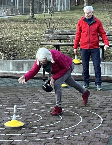 Mitglieder des ESC Glashütte weihten die Tennis-Ehrenamtlichen in die Kunst des Eisstockschießens ein