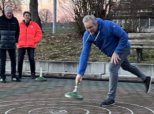 Handarbeit sind Tennisspielerinnen und -spieler gewohnt, wenn sie mit ihrem nicht allzu schweren Schlagwerkzeug gelbe Filzbälle attackieren. Ein anderes Spielgerät und eine andere Form der Handarbeit waren bei der Danke-Veranstaltung gefragt, zu welcher der Abteilungsvorstand der Tennisabteilung als Zeichen der Wertschätzung ihrer Unterstützung die ehrenamtlich engagierten Abteilungsmitglieder eingeladen hatte: Eisstockschießen stand auf dem Programm, das unser Vorstandsmitglied Petra Heß zusammengestellt hatte. 28 Tennisfreundinnen und -freunde waren der Einladung auf den Hasenhof gefolgt. Dort wurden sie von Mitgliedern des ESC Glashütte (auch ihnen gilt der Dank des Tennis-Abteilungsvorstands!) begrüßt und in die hohe Kunst des Eisstockschießens mit dem ca. fünf Kilogramm schweren Spielgerät eingeweiht.
