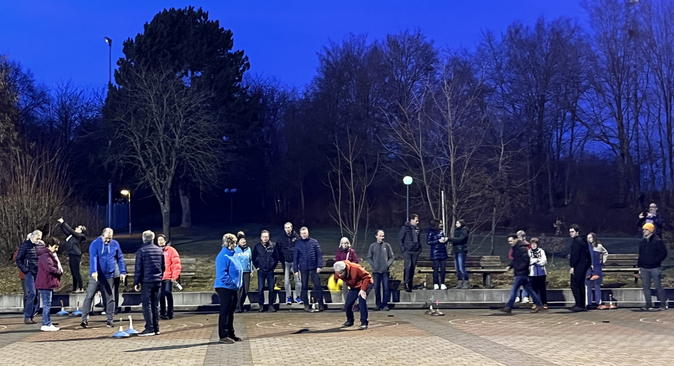 Aufgeteilt in Vierer-Gruppen, spielten jeweils zwei Mannschaften gegeneinander. Nach jedem Durchgang rotierten die Gruppen, so dass sich immer neue Spielpaarungen ergaben. Wer seine Treffsicherheit mit dem ungewohnten Eisstock noch etwas steigern wollte, konnte zu alkoholfreiem Punsch oder Glühwein greifen. Für Gesprächsstoff und Emotionen aller Beteiligten sorgten gute wie schlechte Würfe. Abgerundet wurde die stimmungsvolle Atmosphäre durch das Blau des Himmels, das sich im Verlauf der Veranstaltung zum Nachtblau wandelte. Nach dem Sportprogramm bot sich den Eingeladenen die Gelegenheit, das Erlebte bei einem gemeinsamen Abendessen in der Tennis-Gaststätte „Matchpoint – Dolce Vita“ noch einmal Revue passieren und den Danke-Abend ausklingen zu lassen.
