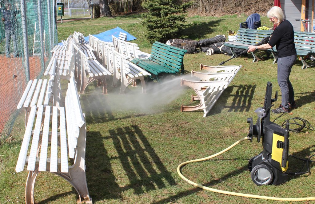 Mit Hochdruck: Reinigen der Sitzbänke für die Außenplätze und die Zuschauer-Bereiche