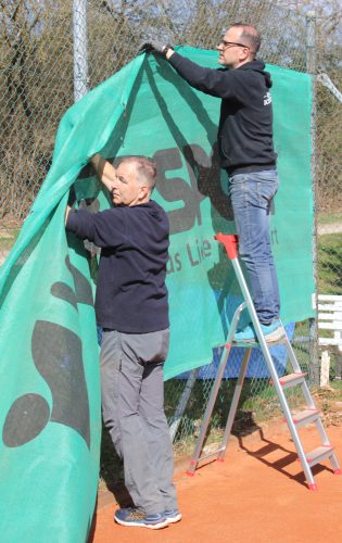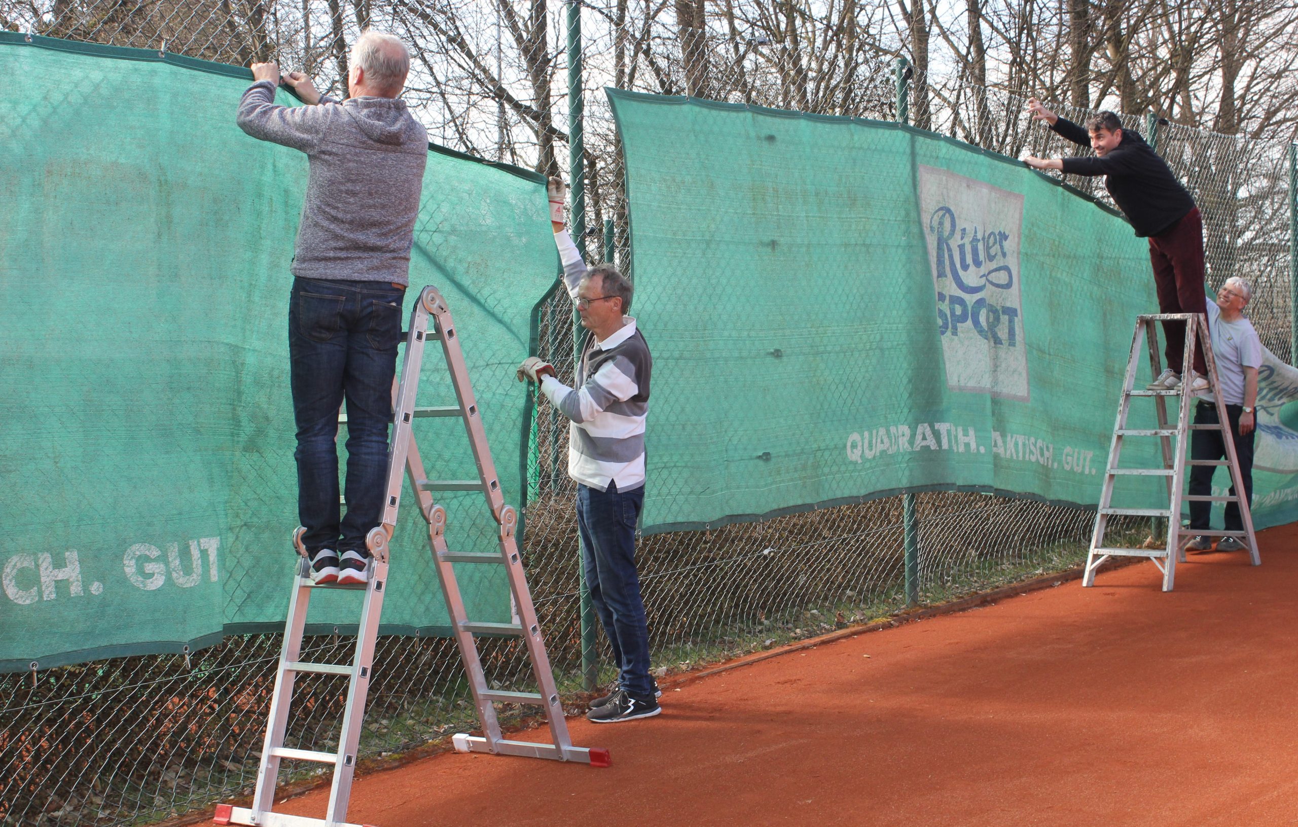 Damit der Blick beim Tennisspielen nicht in die Ferne schweift: Anbringen der Sichtblenden an den Außenplätzen Fotos: WH