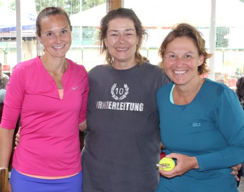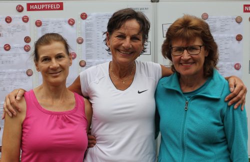 Siegerehrung im Wettbewerb der Damen 40: Turniersiegerin Sandra Jachmann (rechts), Sabine Wittenmaye5r (links, Platz 2), mit Ursel Deinaß