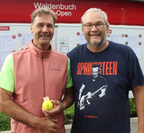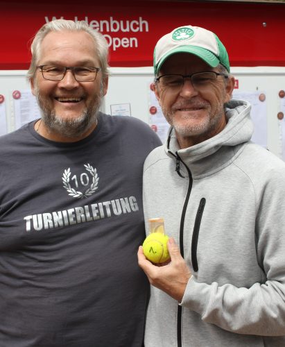 Ihren Anteil am Gelingen der 13. Waldenbuch hatten neben den Spielerinnen und Spielern und dem Organisationsteam – bestehend aus Volker Deinaß, Uwe Schraub, Ursel Deinaß, Valentin Schraub, Bodo Knüppel und Damaris Frank – auch mehrere nicht unmittelbar mit Vorhand und Rückhand, Aufschlag und Volley befasste Turnierbegleiter. Das galt für die Gestalterinnen der Kuchentheke ebenso wie für das Gastronomie-Team des „Matchpoint – Dolce Vita“ und die Sponsoren. Zu deren Beitrag gehörte auch der Gutschein für ein Wochenende in einem Wellness-Hotel, der unter allen Turniersiegerin verlost wurde. Glücklicher Gewinner, in diesem Fall ohne seine ansonsten eindrucksvolle Ballbeschleunigung: Andreas Breitrück, der Turniersieger der Herren 50.
