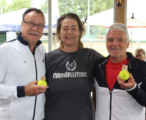Siegerehrung im Wettbewerb der Herren 70: Turniersieger Eugen Lengerer (links), Willy Scheurer (rechts, Platz 2), mit Ursel Deinaß
