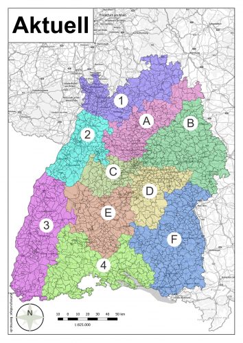 So stellt sich die Tennis-Landkarte in Baden-Württemberg aktuell dar: Es gibt vier Bezirke des BTV (1 bis 4) und sechs Bezirke des WTB (A bis F) Foto/Grafik: Copyright WTB