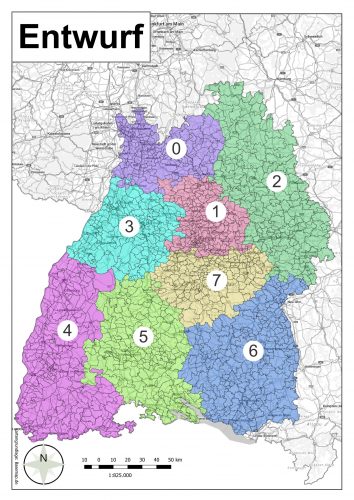 Der Tennis-Spielbetrieb in Baden-Württemberg soll ab der Sommersaison 2026 in acht Regionen (0 bis 7) gegliedert werden Foto/Grafik (Entwurf): Copyright WTB