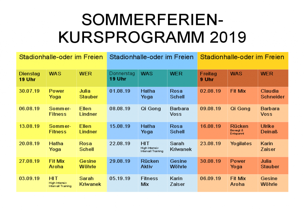 Eine Veranstaltung, die im Abstand von 1 Woche(n) um 9:00am Uhr am Freitag stattfindet und bis 06.09.2019 wiederholt wird.