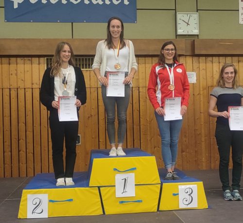 Nun hieß es bis zur Siegerehrung zittern, ob es auf das Treppchen reicht. Am Abend auf der Mehrkampfparty war es nun so weit. Hinter Sabine Storz (Freiburg), die in diesem Jahr ihren 10ten deutschen Titel feierte und Johanna Becker (Zweibrücken) – eine deutsche Meisterschaft, schaffte es Moni auf den anvisierten dritten Platz. Superglücklich, mit etwas Muskelkater und großer Zufriedenheit ging es am nächsten Tag wieder heim.