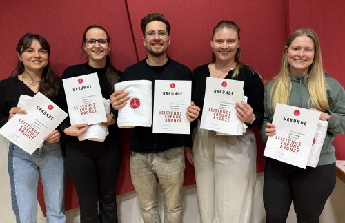Für 10 Jahre treue Mitgliedschaft übergab Steffen die Jubiläumsehrung in Bronze und für hervorragende Verdienste erhielten Jaqueline Socher, Ina Kompalka, Chris Lötterle, Carla Hofmann und Mirjam Ruckh die Leistungsehrung Bronze. Herzlichen Glückwunsch!