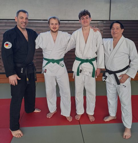 Die Prüflinge waren Merlin Bürkle und Matthias König auf den 2.Kyu Grad (blau).