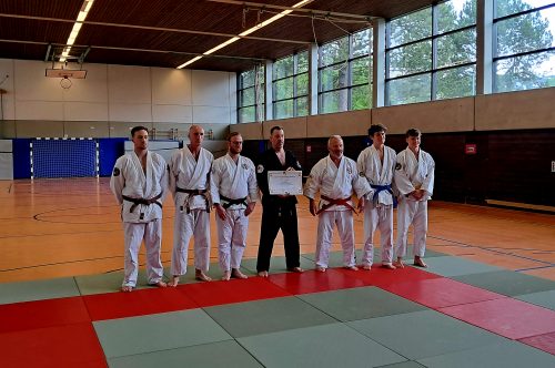 Am 25. April stellte sich Michael Fricke, Dojoleiter, erfolgreich der Prüfung zum 5. Dan Jujitsu. Über drei Stunden hinweg demonstrierte er unter strenger Beobachtung des Präsidenten des Deutschen Fachsportverband für Jiu-Jitsu e.V. Kalla Bergers und dem Vorstand des Verbandes Matthias Kramer eine sehr gute Vorbereitung, ein herausragendes technisches Niveau sowie eine vorbildliche Einstellung zur japanischen Kampfkunst. Seine hohe Trainerkompetenz und seine tiefe Verankerung im Budo-Gedanken wurden dabei in jeder Phase der Prüfung deutlich.