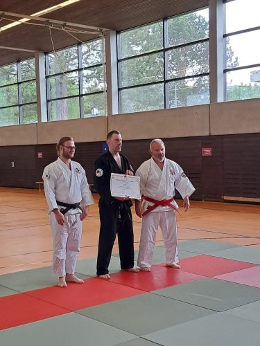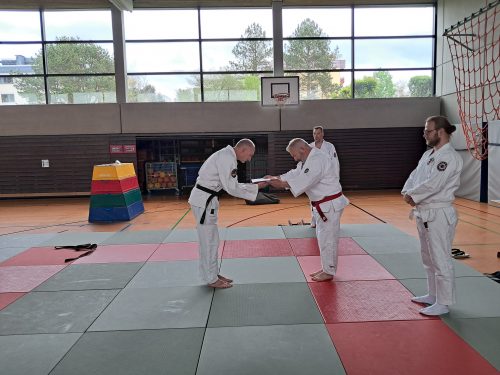 Am 26. April 2025 wurden zwei Schüler (Stephan Legelli und Michael Vögtle) aus dem Dojo von Michael Fricke zur Prüfung zum 1. Dan Jujitsu vorgestellt. Beide zeigten sehr gute Leistungen, was die hohe Qualität der Ausbildung im Dojo Fricke eindrucksvoll bestätigte. Geringfügige Unterschiede in der Kondition, bedingt durch altersbedingte Unterschiede, wurden beobachtet, beeinträchtigten jedoch nicht den insgesamt starken Gesamteindruck.