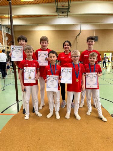 Bereits am Morgen gingen sieben Jungs in fünf Altersklassen an den Start: Leo, Fabi, Thias, Noah W., Noah E., Lasse und Hannes. Der Wettkampf verlief insgesamt zügig und reibungslos. Zwar schlichen sich hier und da kleine Patzer oder vergessene Elemente ein, die ein paar Punkte kosteten – aber auch das gehört im Wettkampf einfach dazu.